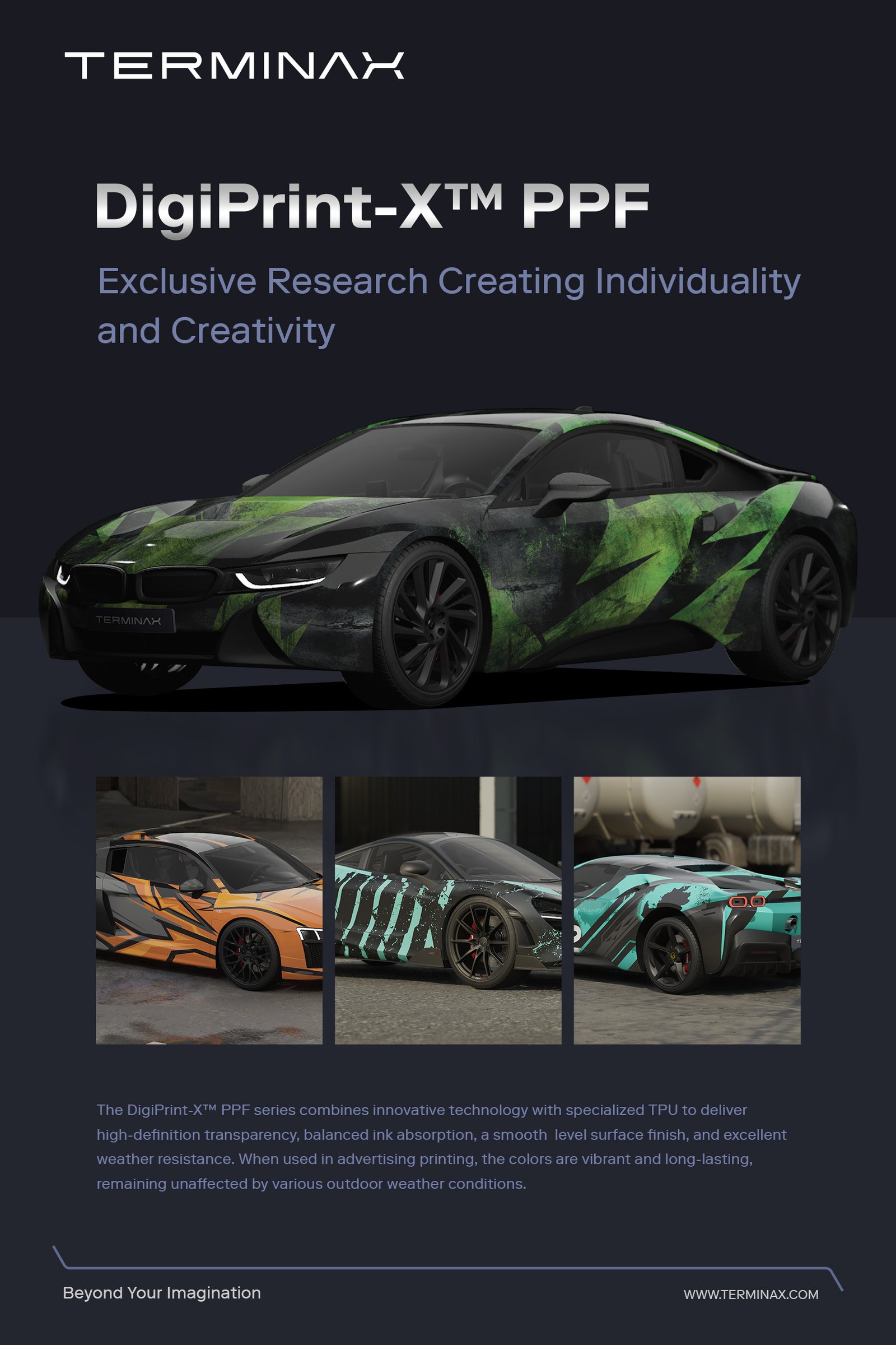 Le DigiPrint-X™ PPF s’impose comme une référence pour les professionnels recherchant un PPF d’impression premium, capable de préserver l’éclat des designs tout en assurant une protection durable du véhicule. Ce PPF transforme chaque projet en une signature visuelle forte, élégante et durable, parfaitement adaptée aux exigences du PPF Terminax.